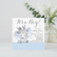 O elefante do chá de bebê elefante convida um adorável elefante bebê vestindo um bonito azul bebê e uma coroa prateada sentada sobre um fundo azul de ponto. Estes convites para bebês de elefante são facilmente personalizados para o seu evento simplesmente adicionando os seus detalhes. Você pode remover a coroa e pode remover o fundo do lado traseiro.