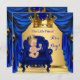 O Príncipe Real Crown Blue Dourado Chá de fraldas Boy no Royal Blue Presidente Throne. Chá de fraldas de Casais giros. Menino Louro de Pele Leve com ouro e convite de Drapes Azuis, novo menino.