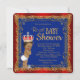O chá de fraldas do príncipe étnico com fundo azul e ouro real e um adorável príncipe pequeno vestindo coroa real em um lindo fundo azul e ouro real. Este convite para chás de fraldas reais, azul e ouro, de ornamentado é facilmente personalizado para o seu evento, adicionando detalhes do seu evento, estilo de fonte, tamanho de fonte e cor e texto.