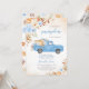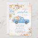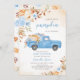 Celebre o seu pequenino a caminho com este adorável Convite de Chá de fraldas Azul Pumpkin Truck. Perfeito para um chá de fraldas de outono para um garoto, este design apresenta um charmoso caminhão azul-vintage cheio de abóboras azuis e laranja, simbolizando o calor e a alegria da estação. Os sotaques florais elegantes em tons de azul, branco e laranja macio emparelhados com as folhas do outono enquadram o design lindamente nos cantos superior esquerdo e inferior direito, adicionando um toque de sofisticação rústica a este convite sazonal. BBS450