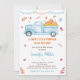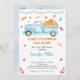 Este convite apresenta folhas de outono bonitas e um caminhão azul cheio de feno e abóboras.