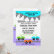 Adorável convite para o tema do carro Race em cores neutras e divertidas de azul-aqua brilhante, roxo e laranja com bandeira branca e preta e carros de corrida coloridos.