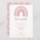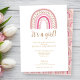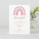 Uma garota fofa! Convite ao chá de fraldas com uma ilustração arco-íris cor-de-rosa e dourada. O design Rainbow também está na parte traseira da placa. Personalize com seus detalhes para informar seus convidados sobre seu evento.