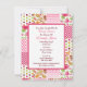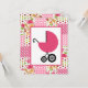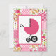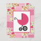 Um convite para chás de fraldas de meninas com ilustração de uma carruagem de bebê rosa-quente sobre um design de fundo que inclui bolinhas, zigzags, paisley, rosas, gingham e listras. Personalize o texto com detalhes da sua ocasião.