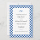 O texto formal e elegante é fácil de personalizar e parece chic enquadrado por um padrão de borda de verificação de gingham azul de lapis com um simples monograma tradicional de três letras no topo deste convite de chá de fraldas clássico.