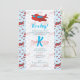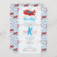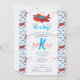 Um padrão de avião vermelho e azul agudo com uma cor de fundo azul clara e um nome personalizado no meio. Convite para chá de fraldas de garoto ideal. A desvinculação da parte pode ser visualizada nesta coleção ou nesta coleção de designs.
