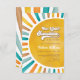 Encharcado em um design retrosolar, esse convite é uma maravilhosa mistura de estética nostálgica e funcionalidade contemporânea. O motivo é um espantoso conjunto de matizes amarelos, azuis, cor de laranja e terracota que criam uma atmosfera quente e convidativa, diretamente do morcego.
