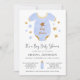 Celebre a futura mãe de um bebê com este convite de chá de fraldas com uma cor azul pastel e dourada de um bebê, cor d'água de um traje de um pedaço, rodeado por estrelas douradas e azuis. O nome do bebê está escrito na roupa (você também pode personalizar ou deixar vazio). "É um Chá de fraldas de Menino" está escrito embaixo em um roteiro de na moda contemporâneo. Uma pequena cor azul pastel e dourada de uma garrafa de bebê no fundo do convite separa o local da festa e os detalhes de RSVP. Você pode personalizar facilmente os detalhes do chá e as informações do registro.
