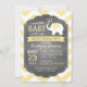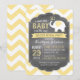 O fundo impressão de chevron amarelo e branco com elefante branco soprando corações, gênero, revela o convite para chás de fraldas.