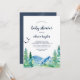 Este convite para o chá de fraldas Rocky Mountain é perfeito para um chá ao ar livre. O design apresenta uma paisagem de natureza selvagem pintada, azul e verde, com pinheiros de aquarela, pássaros e montanhas.
