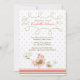 Esta carta de convite para chás de fraldas de chique mostra uma ilustração de uma ave de mamãe doce com uma cauda suave e uma impressão de cor damasco rosa no corpo dela com sua linda menina que se parece com ela. O fundo tem um pequeno padrão de bolinhas rosa.