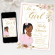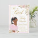 Chá de fraldas de princesa rosa e dourada com adorável menina africana com cabelo bonito e trançado vestindo um bonito tutu de princesa rosa e arco de cabelo num fundo floral cor-de-água rosa e dourado. Este convite para chás de fraldas cor-de-rosa giro e dourado é facilmente personalizado para o seu evento simplesmente adicionando os detalhes do seu evento. As palavras "É uma Garota e Chá de fraldas" não podem ser mudadas.