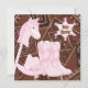Banda marrom adorável com botas cor-de-rosa, chapéu de cowboy, crachá do xerife e convites para chás de menina de pônei. Adicione seus detalhes à parte frontal e/ou traseira deste convite de chá de fraldas de vaqueira rosa e marrom giro adicionando seus detalhes de evento, estilo de fonte, tamanho de fonte e cor e texto.