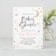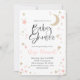 Estrelas brilhantes cor-de-rosa e douradas com uma borda lua crescente um fundo branco com script preto com letra parelha a ler "chá de fraldas" no centro do convite. O verso apresenta um plano de fundo de faixa cor-de-rosa e branca. A escolha perfeita para o seu próximo chá de fraldas.