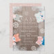 Este cartão de convite para chás de fraldas giro e rústico apresenta um fundo de madeira rusitico com animais de floresta/inverno que são uma raposa, um coelho, um urso polar, um panda vermelho, flocos de neve e a neve nos cantos. O verso apresenta um fundo cor-de-rosa para bebês com padrões brancos de neve. Personalize-o para as suas necessidades. Você pode encontrar mais produtos para urso polar na minha loja.