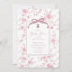 Elevem a celebração do chá de fraldas com o nosso belo convite para a apresentação de fotografias florais, cor-de-rosa e branco, que inclui um encantador padrão toile de jouy. Esta peça elegante mostra um arco de coquete e um delicioso ursinho de pelúcia. Perfeitamente concebido para dar um tom sofisticado ao seu evento, este convite não só transmite a sua alegre ocasião, como também adiciona um toque de elegância eterno que os seus convidados adorarão. Torne seu chá de fraldas inesquecível com este convite incrível que reflete estilo e graça.