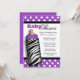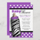 Na moda Baby Shower convites projetados com bolinhas brancas sobre roxo e com uma garrafa de bebê impressa em zebra.