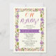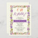 Oh Chá de fraldas, roxo e laranja, convite na fronteira floral, mostrando a frase "Oh baby" em roxo e laranja, uma ilustração de uma fronteira floral feita de lindas flores selvagens em folhas roxas, laranja e verde-oliva em fundo de marfim. Texto preto e branco em uma faixa roxa.