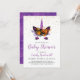 Este doce convite para chás de fraldas tem uma linda face unicórnica com buzina e pálpebras, com buzinas e bugigangas roxas, adornada com um buquê de outono de flores laranja, pretas e roxas e deixa sobre as palavras "Chá de fraldas" em roxo escrito em pincel. O faux gold confetti cai de cima. Personalize com o nome da futura mãe no script roxo, juntamente com os detalhes da fonte sans serif preta. Ideal para um chá de fraldas de outono.