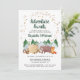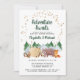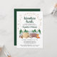 O convite para chás de fraldas rústico doce, com uma ilustração fofinha de animais da floresta, com sua tenda acampada nas montanhas e na floresta, uma camada de estrelas de ouro e "Aventura Aguarda" e os nomes da mãe e do pai em um roteiro verde de caça escuro. Personalize facilmente os detalhes do chá.