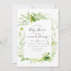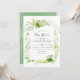 Convite de chá de fraldas verde que inclui samambaias, flores silvestres e morangos e um fundo de lavagem de cor verde-aquosa.