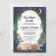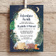 Convite à chá de fraldas de casais russos com uma ilustração fofa de animais da floresta com a tenda acampada nas montanhas e na floresta, uma camada de estrelas de ouro e lua num céu noturno e "Aventura Aguarda" e os nomes da mãe e do pai num roteiro azul escuro da meia-noite.
