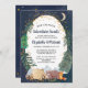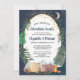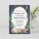 Convite à chá de fraldas de casais russos com uma ilustração fofa de animais da floresta com sua tenda acampando nas montanhas e na floresta, uma camada de estrelas de ouro e lua no céu noturno, "Nossa Maior Aventura Espera" e os nomes da mãe e do pai em um roteiro azul escuro da meia-noite.