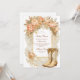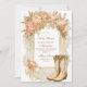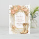 Um design de chá de fraldas cônico rústico com botas de vaquinha acentuadas com peônias cor-de-rosa pinceladas, verde macio e detalhes de ouro em ximersão. Perfeito para uma celebração de temas ocidentais com uma reviravolta floral feminina.
