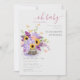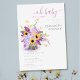 Um buquê rico feito de flores exuberantes, girassóis, lavandas, trigo, hálito de bebê, maria e ranúnculo faz uma bela ilustração, pintada à mão em aquarela digital, que decora este elegante convite para chás de fraldas rústico. Romântico e encantador, é uma escolha encantadora para qualquer cenário rústico.