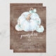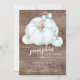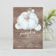 Doce abóbora está no caminho o convite para o chá de fraldas com abóboras azuis claras adornadas com arcos azuis em um fundo de madeira rústica.