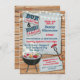 "Pãozinho no forno e hambúrgueres na grelha", convites para chuveiros de churrasco. Apresenta uma grelha fumante de churrasco, luzes cintilantes e papel antigo sobre um fundo de madeira russa. Perfeito para um chá de fraldas ao ar livre ou no quintal.
