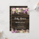 O convite para chás de fraldas florais girassosos apresenta flores de cor d'água roxas e luzes de corda em um fundo de madeira de casca escura. Perfeito para primavera ou chá de fraldas de verão.
