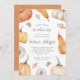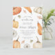 Os convites encantadores para chuveiros de bebês apresentam uma borda de abóboras aquáticas mudas e folhas de outono, com os detalhes do seu chá de fraldas em letras de cinza. "Uma pequena abóbora está no caminho" aparece no topo. Perfeito para chás de fraldas de outono ou época de Halloween.