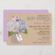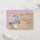 Hydrangeas da lavanda no frasco de pedreiro com etiqueta do Tag do cair do "bebê" sobre o cartão neutro do convite do chá de fraldas do género rústico do teste padrão do fundo do linho-olhar.