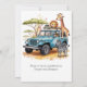 Uma ilustração de um jipe azul alegre do céu estacionado em uma duna arenosa. O jipe tem um tejadilho branco com três animais cártaros brancos — uma girafa sorridente, uma zebra curiosa e um leão lúdico — empoleirados em cima. O fundo apresenta dunas que rolam sob um céu brilhante e ensolarado com nuvens brancas e palmeiras distantes. Sombras gentis espalhadas pela cena, criando um sentimento alegre e aventureiro.