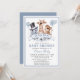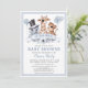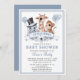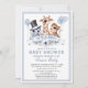 Um cartaz na frente dos animais safari anunciam que é um menino! Uma girafa bonita está no centro, com um elefante em um chapéu de cima à esquerda e um macaco à direita. Os balões azuis estão em ambos os lados. Um quadro azul duplo envolve os animais safari e os detalhes do chá de fraldas. Se precisar de coordenar os itens, por favor, envie-me uma mensagem. Sou Nelda e estou sempre feliz em ajudar.
