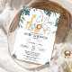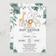Folhagem Verde Neutra de Gênero Moderna Watercolor Chá de fraldas Safari Convite chá de fraldas safari neutro de gênero com o mesmo tema, com quatro animais da selva bonitinhos, folhagem azul verde e divisores na disposição do texto.
