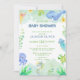 Cartão modelo de convite para chá de fraldas do tema Cute Safari com ilustração desenhada à mão de uma girafa, leopardo, rinoceronte, leão, elefante e zebra. O texto diz "um pouco selvagem está a caminho". Convidado perfeito e neutro em termos de gênero.