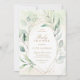 Chá de fraldas moderno com folhas de eucalipto e verde em torno de uma falsa estrutura geométrica de ouro. Dentro são seus detalhes de evento em tom dourado, sobre uma lavagem a aquarela pastel e a parte traseira é uma sombra de verde macio. Este convite elegante e rústico é excelente para um chá de fraldas de temas botânicos e o design neutro por gênero funciona para um menino ou uma menina.
