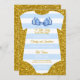 este é um convite para chás de fraldas super fofo e simples com uma unidade azul e branca com listras em fundo brilhante.