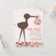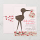 Um convite moderno à moda do chá de fraldas que caracteriza uma ilustração de uma cegonha do marrom que leva uma aguarela inspirou o pacote do impressão da flor de cerejeira. Parte inferior e ilustração de harmonização no reverso. Personalize o texto vermelho e marrom na parte dianteira e na parte traseira. Artigos de harmonização Look for no Paperie de Jill