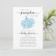 Um convite para chá virtual, bonito, alegre e brilhante bebê, com "A Sweet Little Pumpkin Is On Your Way" escrito em uma mistura de tipografia moderna de cinza mole e roteiro de na moda, e uma aquarela pastel azul de abóbora decorada com brilho sujo e faíscas. Por baixo, o "chá de fraldas" é escrito no mesmo roteiro de na moda e você pode personalizar o nome da mãe e os detalhes do chá virtual em um mínimo de tipografia moderna.