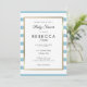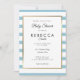 Com um clássico fundo azul-bebê e listras brancas, este elegante chá de fraldas, salpicador ou chá apresenta uma elegante borda de folha de ouro falsa que enquadra seus detalhes em tipografia quic. Projetado por Thisnotme©