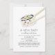 Este convite de chá de fraldas giro e kawaii "um novo bebê está a rolar para a cidade", neutro em relação ao gênero, apresenta um rolo sushi com dois pauzinhos em aquarela em um fundo branco. O verso apresenta um fundo branco com padrões de ondas de cinza. Altere a cor de fundo tanto na frente quanto no verso e personalize-a para suas necessidades.