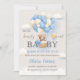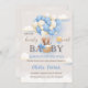 Este convite para o chá de fraldas apresenta um ursinho de pelúcia bonito sentado numa cesta suspensa por balões azuis e cremosos, parecendo um balão de ar quente. A palavra "BABY" aparece em letras grandes por baixo do urso. O fundo é macio com nuvens fofinhas, estrelas cintilantes e uma estrela sorridente. A design exude calor e charme, ideal para um chá de fraldas.