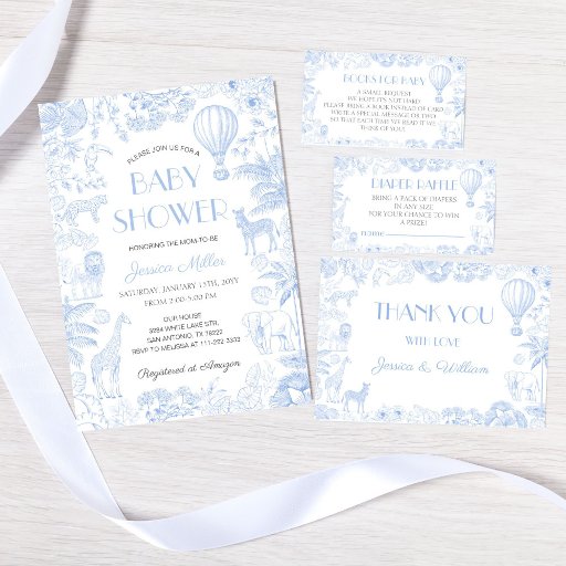 Elegante Blue Toile de Jouy Floral Chá de fraldas Convite, com um charmoso tema animal safari. Este convite maravilhosamente desenhado mostra um balão de ar quente junto com adoráveis animais safari como uma girafa, elefante, zebra e leão, todos colocados contra um fundo floral de chinoiserie azul. Com sua estética vintage e sua tipografia graciosa, este convite dá o tom para uma celebração de eterno. Totalmente personalizável para combinar os detalhes do seu evento, é a escolha perfeita para o chá de fraldas com o tema safari de um garoto, combinando encanto e sofisticação.