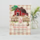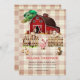 Trendy Rustic Country chá de fraldas Invitation apresentava quintal com animais de fazenda, celeiro vermelho e fundo de xadrez.