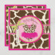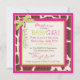 Tutu de jumper de impressão chita selvagem e divertido na linha de clothesline, num fundo de impressão animal, e arco de 3D e fita para um convite de chá de fraldas feminino. As cores são pinks, verdes e browns.