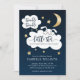 Carteira de convite para chá de fraldas para sua festa de tema de estrela giratória! Ilustração de nuvens com um coelho espiando sua cabeça de um deles. Há textos dentro das nuvens que dizem: "Estrelinha cintilante, você sabe o quanto você é amado?" Há lua brilhante dourada e estrelas num fundo azul marinho escuro. A seguir, as informações da parte chá de fraldas. Os textos são facilmente personalizáveis online. Este convite foi desenhado para um chá de bebê. Ilustração e design do Namibear Art Studio. ©Namibear