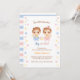 Bebês, menino e menina bonitos de desenho animado, em rombos azuis e cor-de-rosa e bíblias amarelas segurando batalhas correspondentes. Adorável e original convite para chás de fraldas.